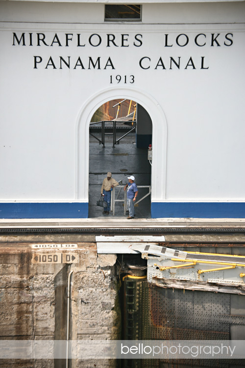I think the guys in the next photo were Panamanian inspectors…they don’t look terribly busy inspecting, but with 8 hours to pass through the locks, I guess they had lots of time to take a break and wave to onlookers.