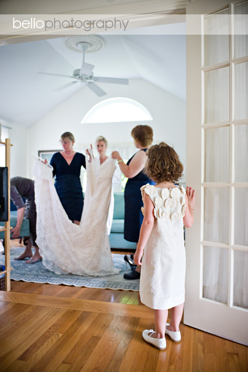 Paul’s cousin’s daughter, Kaitlyn, looks on as Rachel gets ready to step into her dress.