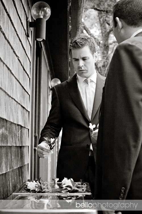 Paul works in production, so he was paying close attention to all of the last minute details the morning of the wedding…I love this perspective and he passes out boutonnieres to his groomsmen.