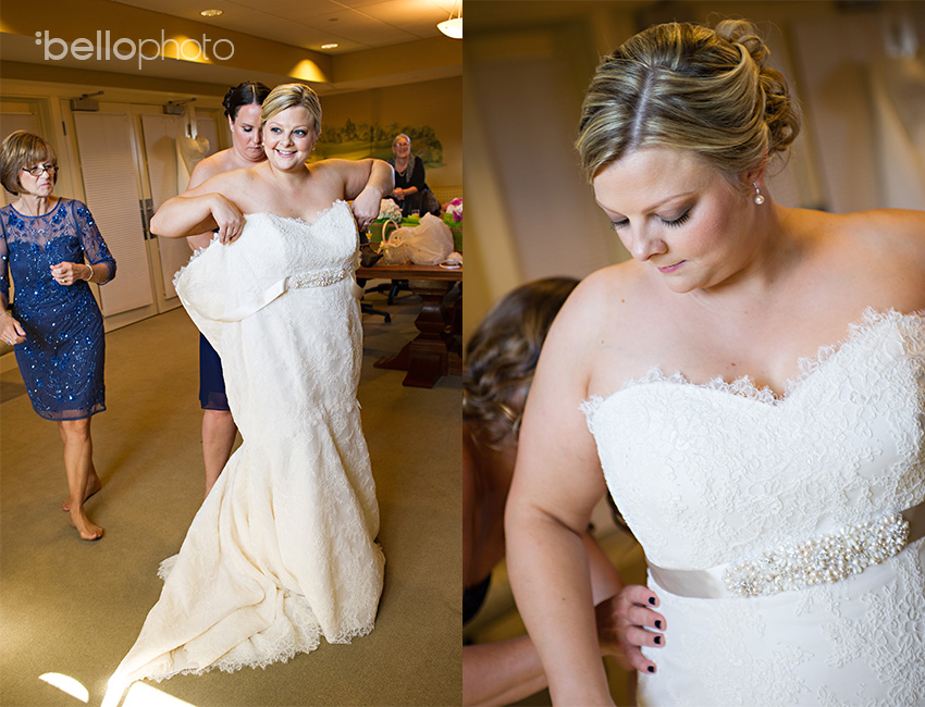 Our beautiful bride Kelly, gets a helping hand getting into her stunning gown from her crazy sweet momma, Dawn (love her!!) and one of her besties, her sister-in-law and MOH, Kristin. Isn’t Kelly gorgeous? And, that smile….lights up every room she enters!