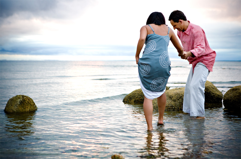 I just love this one. I love the light created by the overcast sky, the colors, the composition, and the glassy quality of the water. But, mostly, I just love the way Kevin is so delicately leading his sweetie across the rocky beach bottom. Awwww…