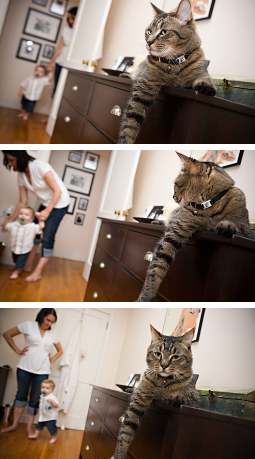 This is kind of a funny series. If you’ve ever owned a pet and then had a baby, you know, as does your pet, that when baby comes home, the ranking of your pet in the family hierarchy suddenly changes. And sadly for poor kitty, the change is not in his favor. Can’t you just see what he’s thinking?