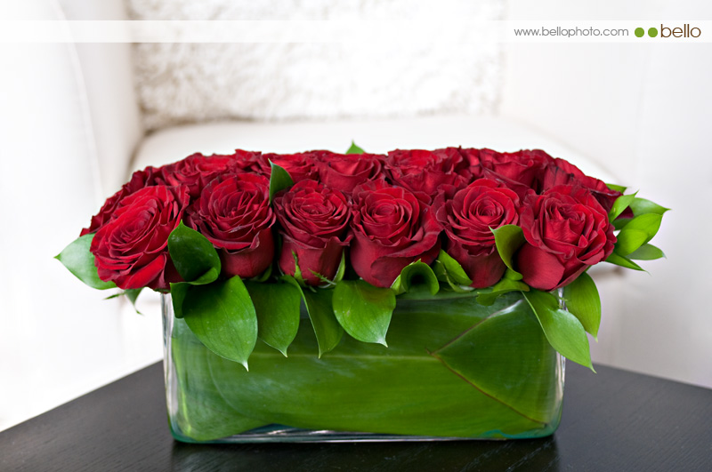 Shama did two arrangements of the roses, a tall 2-dozen bouquet and another two dozen cut short in a super cute rectangular vase. The tall vase also featured kangaroo paw, which is a really cool, fuzzy red plant that accented the deep red rose color perfectly.