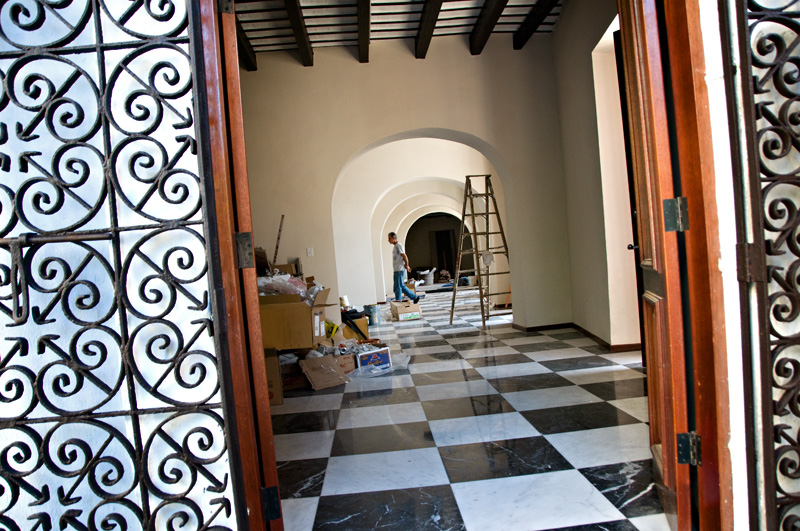 Renovations to a gorgeous building in Old San Juan…I just love the wrought iron door, the arched doorways and the contrasting black & white tiles against the beams in the ceiling. The worker walking through the shot just completes the picture for me. Talk about a sweet pad!!!