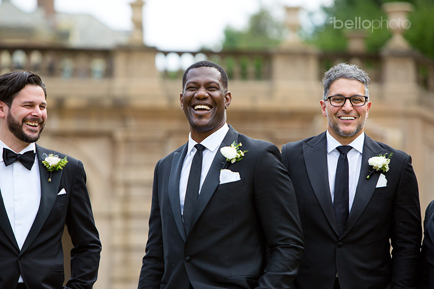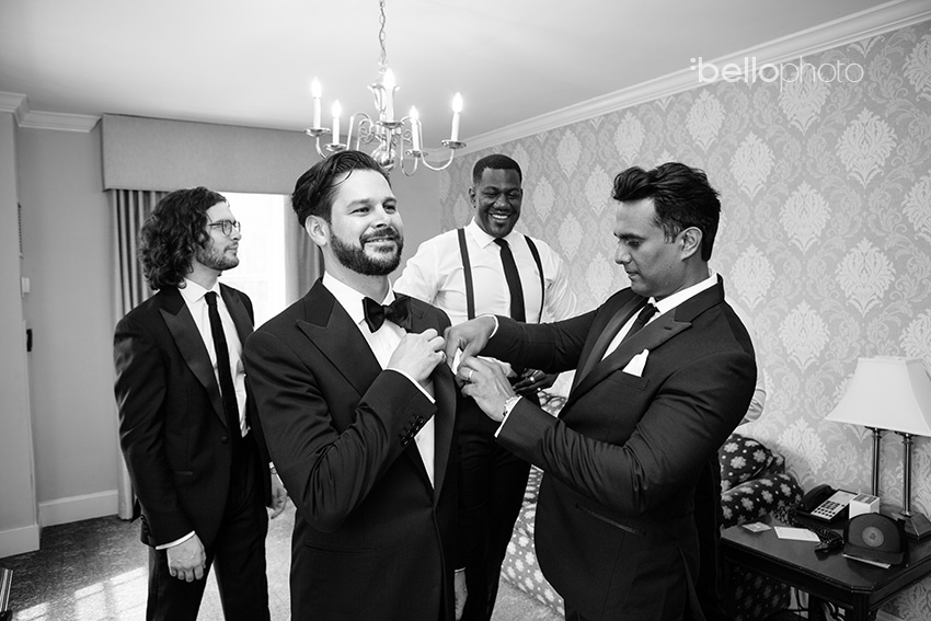 Pocket square placed, thanks to the help of groomsman, Sean, while brother, Sam, and best man, Les, look on. Josh wore the crap out of his Ralph Lauren tux.