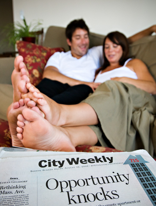 With this being our first real pregnancy session, we decided it would be best to shoot Tracy & Will where they are most comfortable…in their home. So, we drove up to Boston with a trunk full of gear to set up a mini studio in their adorable Boston apartment. Our very good friend Sue Asaro (who does amazing portraits by the way) was kind enough to lend us a bunch of studio lighting so we could create some pretty fierce photos…our favorites are a bit more exposed than we felt comfortable sharing, but take our word for it, they are killer!!!