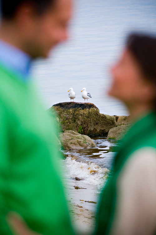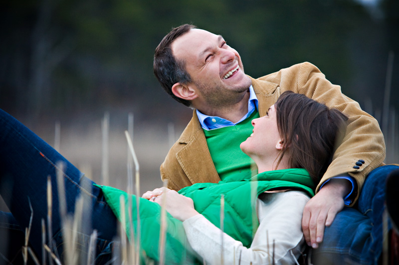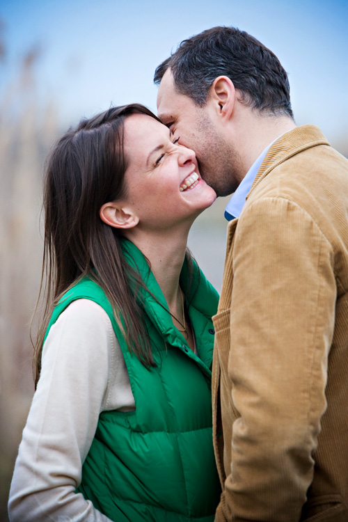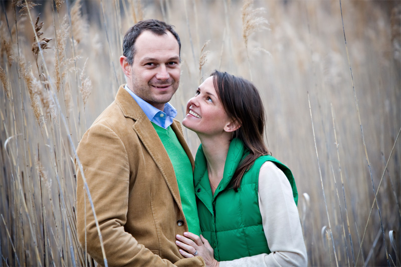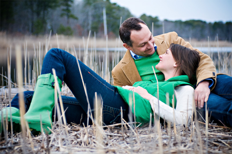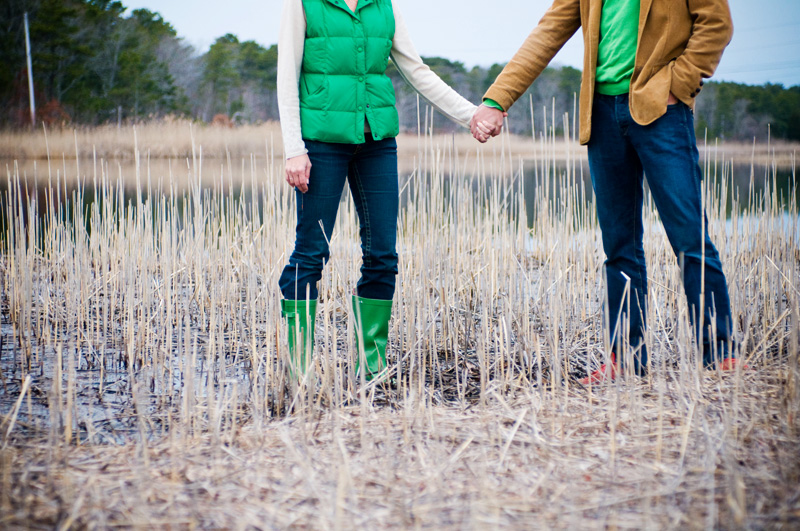 They didn’t plan to wear matching tops….Dennis’s luggage was actually lost in transit from Spain, so he had to make a quick stop at Banana Republic and he just happened to pick a sweater that matched Kirsten’s vest. A happy accident! And, we loved the way the green (especially Kirsten’s adorable wellies) popped in the winter-bleached marsh beach grass. Poor Dennis soaked his shoes….oh, what our fabulous couples will do for a cool shot!!! You guys Rock!!