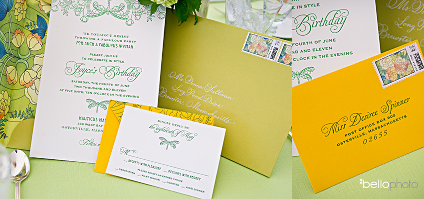 These gorgeous letterpress invitation made by Ceci New York were boldly sized at approximately 8″x10″ and featured custom-designed artwork on the back of the invite and inside the envelope. They were stunning!
